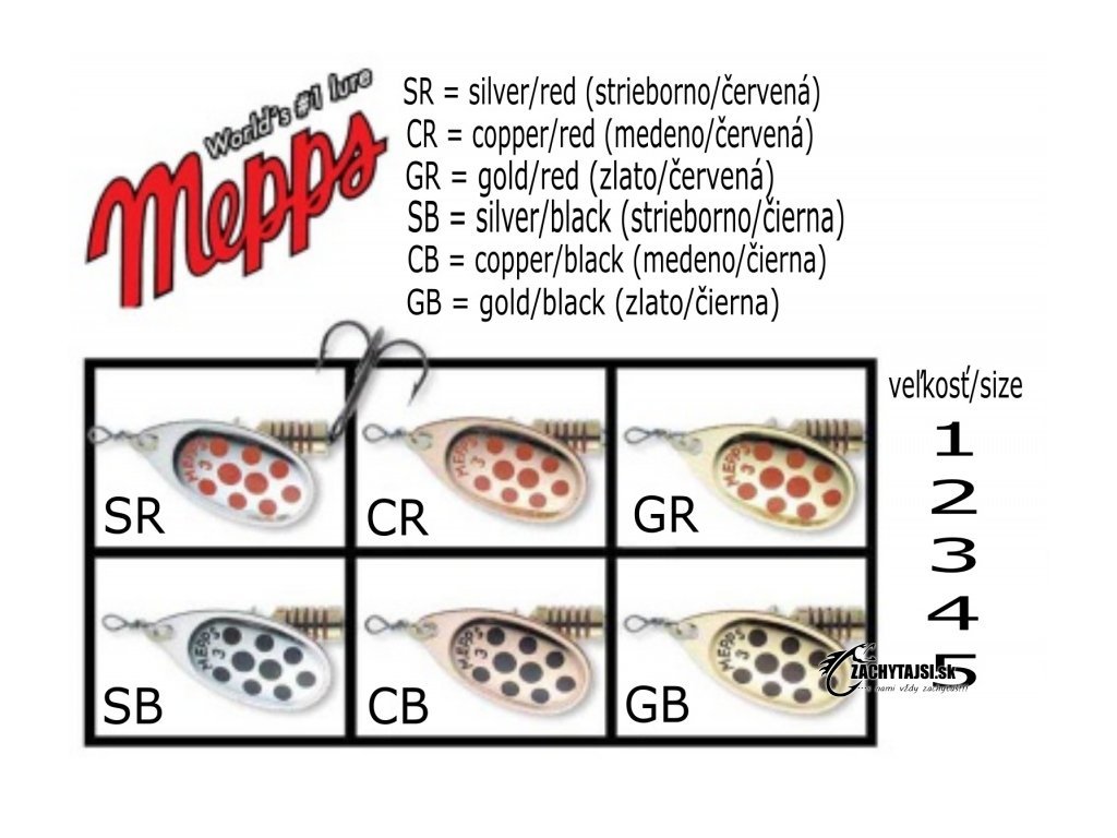 Jeden zo základných modelov rotačiek Mepps, širšie krídelko striebornej, zlatej alebo medenej farby s červenými alebo čiernymi bodkami, precízne mechanicky spracovaná, rotuje spoľahlivo.Dodatočné parametre