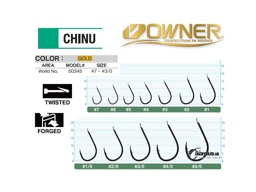 Owner je japonská tradičná značka, svetová jednotka vo výrobe háčikov.Ďalší háčik zo série Chinu - klasický tvar s lopatkou. Rozdiel je iba v povrchovej úprave. Väčšie veľkosti sa používajú na lov kaprov na ťažko, s krmítkom. Menšie veľkosti sa používajú na lov s plavákom a na feeder. Háčiky vynikajú najmä dlhodobou ostrosťou a pevnosťou.