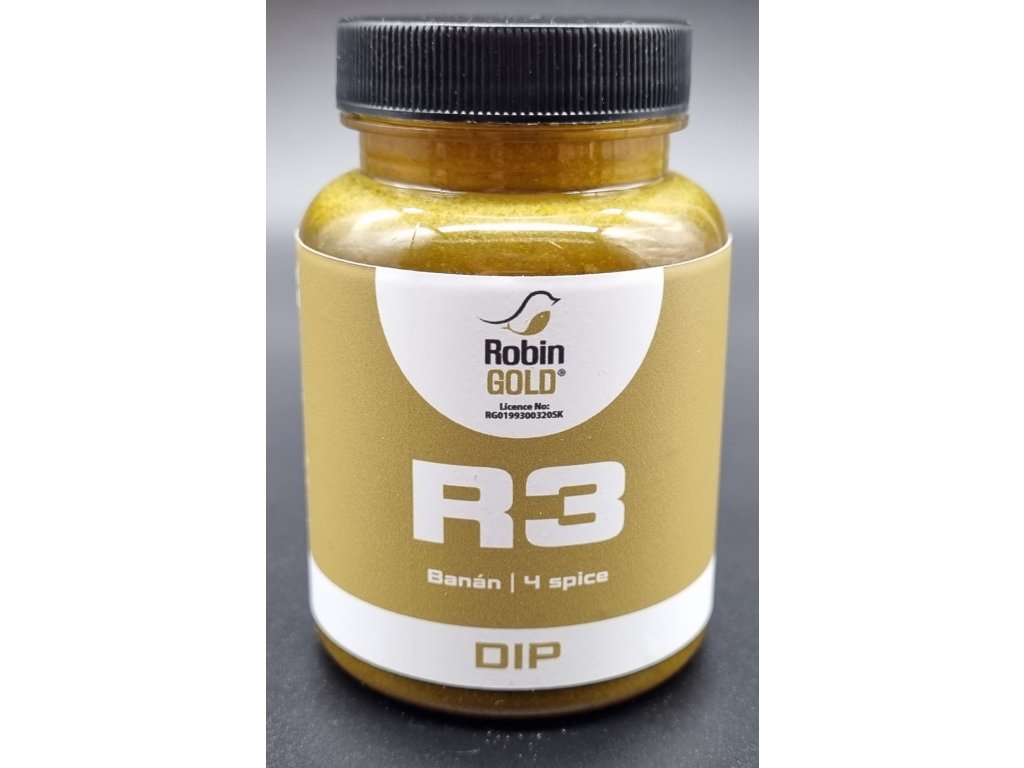 Vlastnosti Dipu : Dip je vyrobený za použitia glycerolového základu ktorý je vinikajúci nosič, obsahuje zložky R3 aminokomplexu a arómy v kombinácí z tekutov potravou. Je jemne krémový hustý a pomaly rozpustný. R3 je boilies ktorý obsahuje čistých 20% originál Robin goldu, jeho farebnosť je tak prirodzená. Bol vyvážený rybími múčkami, jemným vtáčím zobom Birdfood s anýzom a vyváženým pomerom 4 koreni v kombinácií s tigrím orechom a banánu pre dosiahnutie rýchlych záberov.