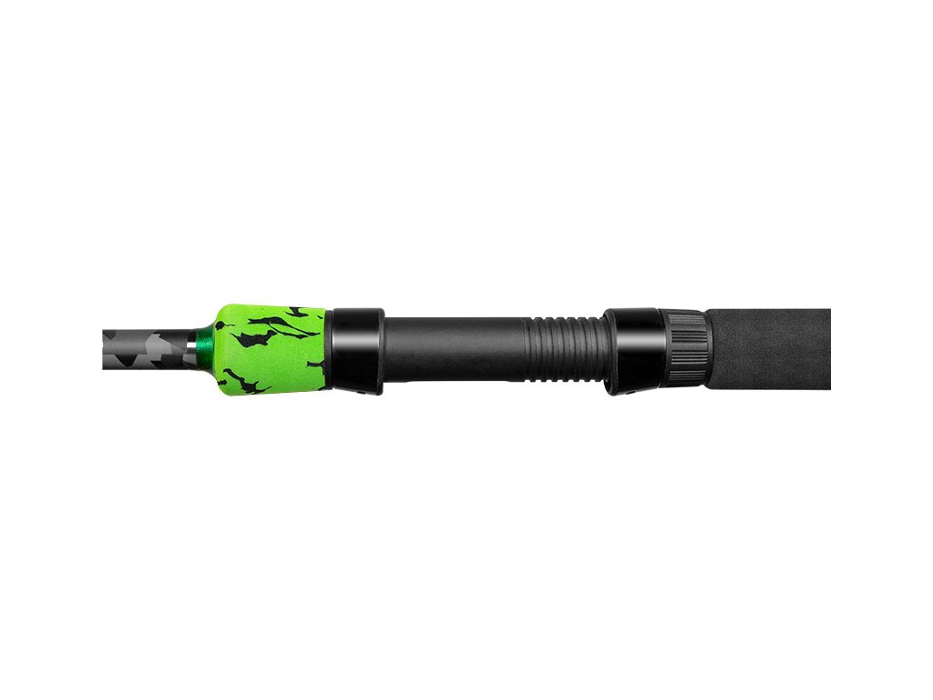 Plná rukoväť, vyrobená v kombinácii čiernej EVA peny so zeleno-čiernou kamuflážou dokonale ladí a zároveň poskytuje maximálny komfort pri rybolove. Nad rukoväťou nájdeme kontrastné zelené vinutie a označenie série v kamuflážovom poli GreenCODE.
