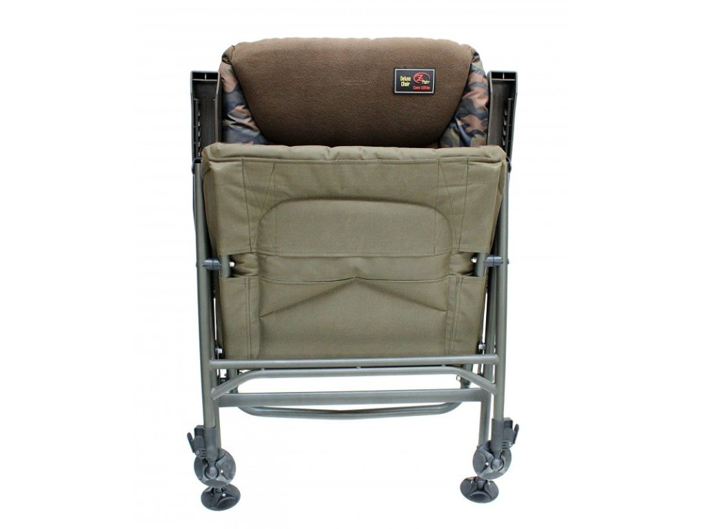 ZFISH představuje inovované křeslo Deluxe Camo Chair. Je to náš starý známý bestseller v novém kabátě. Jedná se o vylepšenou verzi Deluxe Chair v našem stylovém camo provedení. Použitím kvalitních materiálů jsme dosáhli snížení jeho hmotnosti při zachování pevné a stabilní konstrukce s nosností do 150 kg. Samozřejmostí je kvalitně polstrovaný sedák a opěrka z microfleece materiálu. Camo lemování je vyrobeno z voděodolného materiálu Ripstop. Křeslo vyniká vysokou opěrkou zad. Každý ocení polohovatelné područky, které umožňují až 8 různých poloh nastavení opěrky. Široké patky nohou zabraňují boření se v měkkém terénu a díky rychloklipům je nastavení polohovatelných nožiček hračkou. Toto křeslo poskytuje maximální komfort nejen rybářům, ale všem, kteří rádi tráví čas pohodlným posezením v přírodě.