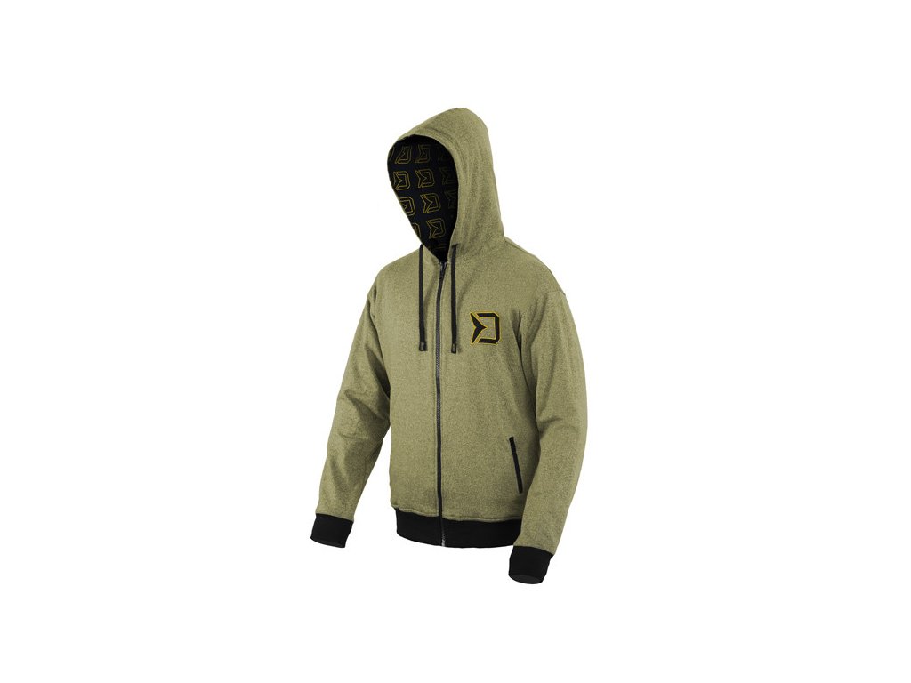 Mikina Delphin RAWER TWO je séria štýlových mikín s kapucňou, ktorá prináša novú dimenziu komfortu. Dostupné sú v tmavozelenej farbe a doplnené o tmavozelené manžety na páse a rukávoch. Poznávacím znakom tejto série je praktický zips, ktorým vieme mikinu úplne rozopnúť a dve oddelené vrecká na zipsy, ktoré boli navrnuté tak, aby si do nich mohol rybár pohodlne odložiť svoje ruky. O vysokej kvalite tohto produktu svedčí aj použitie špičkových zipsov značky YKK. Ťaháčiky zipsov majú na sebe logo Delphin. Vzadu nájedeme veľké logo Delphin, vkusne olemované zelenou farbou. Vpredu vľavo na hrudi nájdeme rovnaké logo malých rozmerov. Kapucňa je z vnútornej strany doplnená o čiernu látku s potlačou loga Delphin. Kapucňu viete stiahnuť jednoducho šnúrkami čiernej farby, na ktorých koncoch sa nachádza našité logo Delphin RAWER. To isté logo vo väčšom rozmere nájdeme našité aj na manžete vpredu dole na ľavej strane.