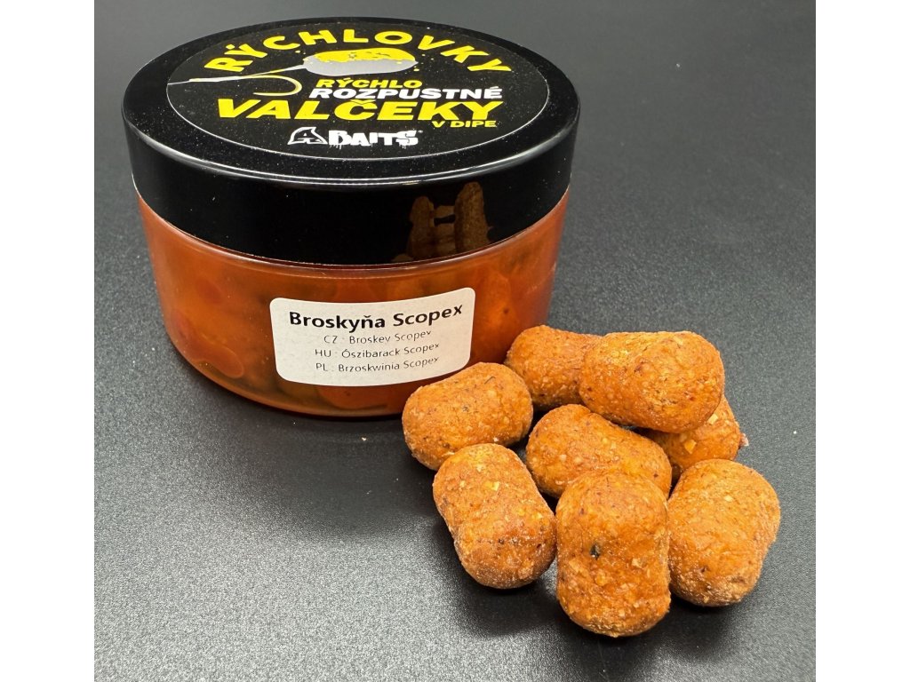 Rýchlovky - Rýchlorozpustné valčeky sú nový produkt, ktorý je v priemere 15x20mm čiže má valčekový tvar. Preto valćekový tvar lebo pri rozpúštaní vzniká elipsovitý tvar ktorý je stabilný aj na dne v rieke. Je dipovaný v silnej esencií čo rozhodne zvyšuje atraktivitu medzi všetkymi druhami rýb.