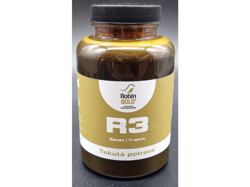 Vlastnosti Tekutej potravy : Tekutá potrava je vyrábaná zo zložiek receptu R3. To znamená že obsahuje všetky atraktanty, koreniny ktoré sú použité v boilies. Je veľmi nutrične, pachovo atraktívna. Zanecháva výraznú pachovú stopu, drži sa bodovo v mieste kŕmenia a nerozplýva sa do veľkej diaľky. Je vhodná na bodové kŕmenie. R3 je boilies ktorý obsahuje čistých 20% originál Robin goldu, jeho farebnosť je tak prirodzená. Bol vyvážený rybími múčkami, jemným vtáčím zobom Birdfood s anýzom a vyváženým pomerom 4 koreni v kombinácií s tigrím orechom a banánu pre dosiahnutie rýchlych záberov.